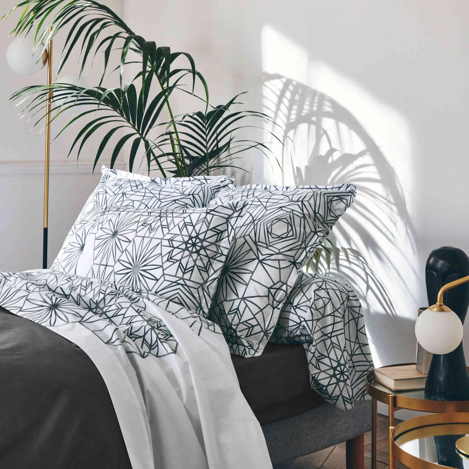 Parure de lit percale Gabrielle jais – Tradilinge. Cette parure de lit est un atout de confort et de dĂ©coration moderne exceptionnel. La parure de lit Gabrielle jais prĂ©sente un jeu de motifs gĂ©omĂ©triques fleuris anthracite sur fond blanc, ce qui donne un style Ă la fois tendance et Ă©lĂ©gant.