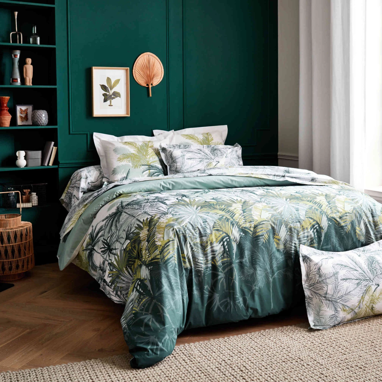 Parure de lit percale Trinidad mousson – Tradilinge. Cette parure de lit est un atout de confort et de décoration moderne exceptionnel. La parure de lit Trinidad mousson présente un joli motif tropical dans différents tons de vert réhaussant le fond blanc, ce qui donne un style à la fois tendance et élégant.