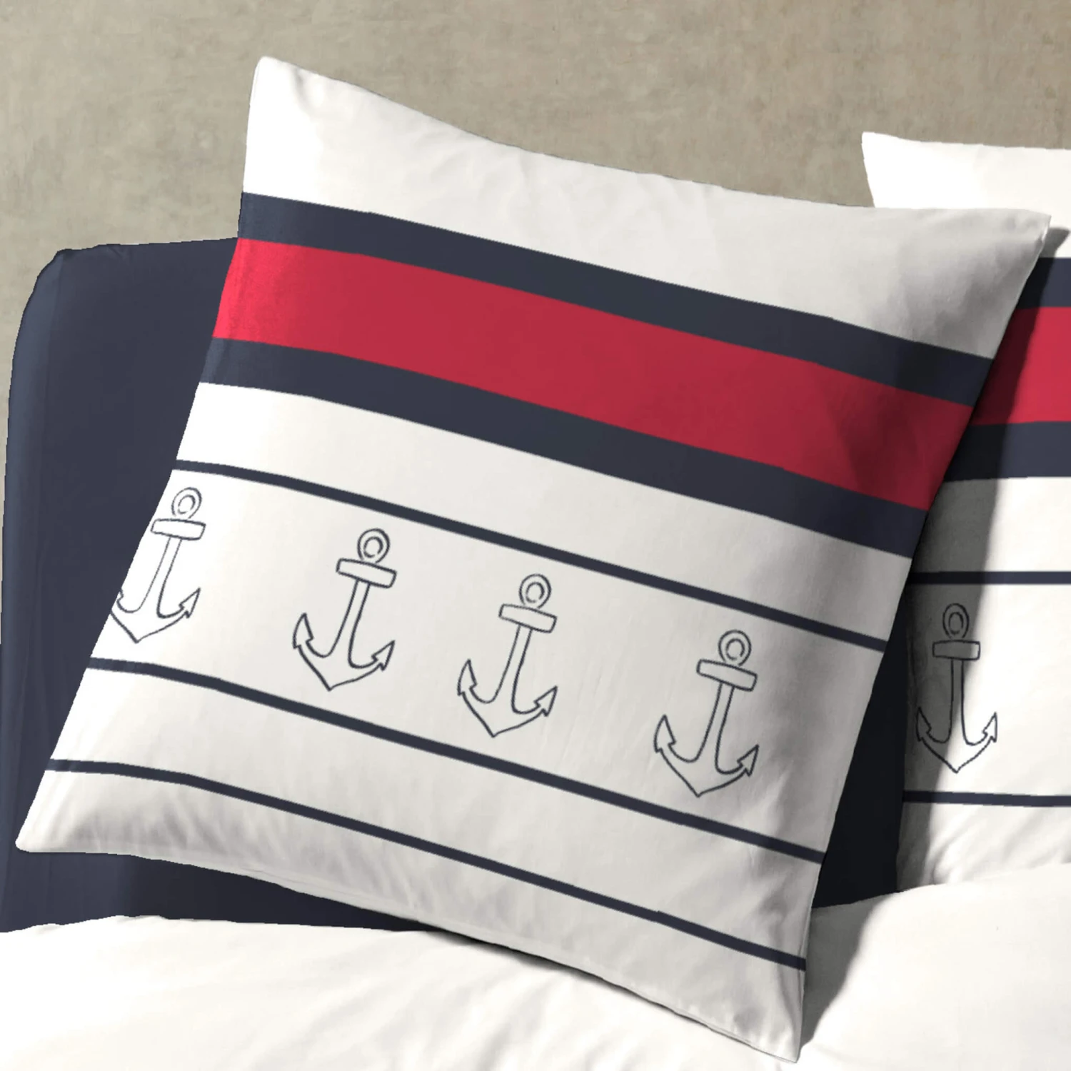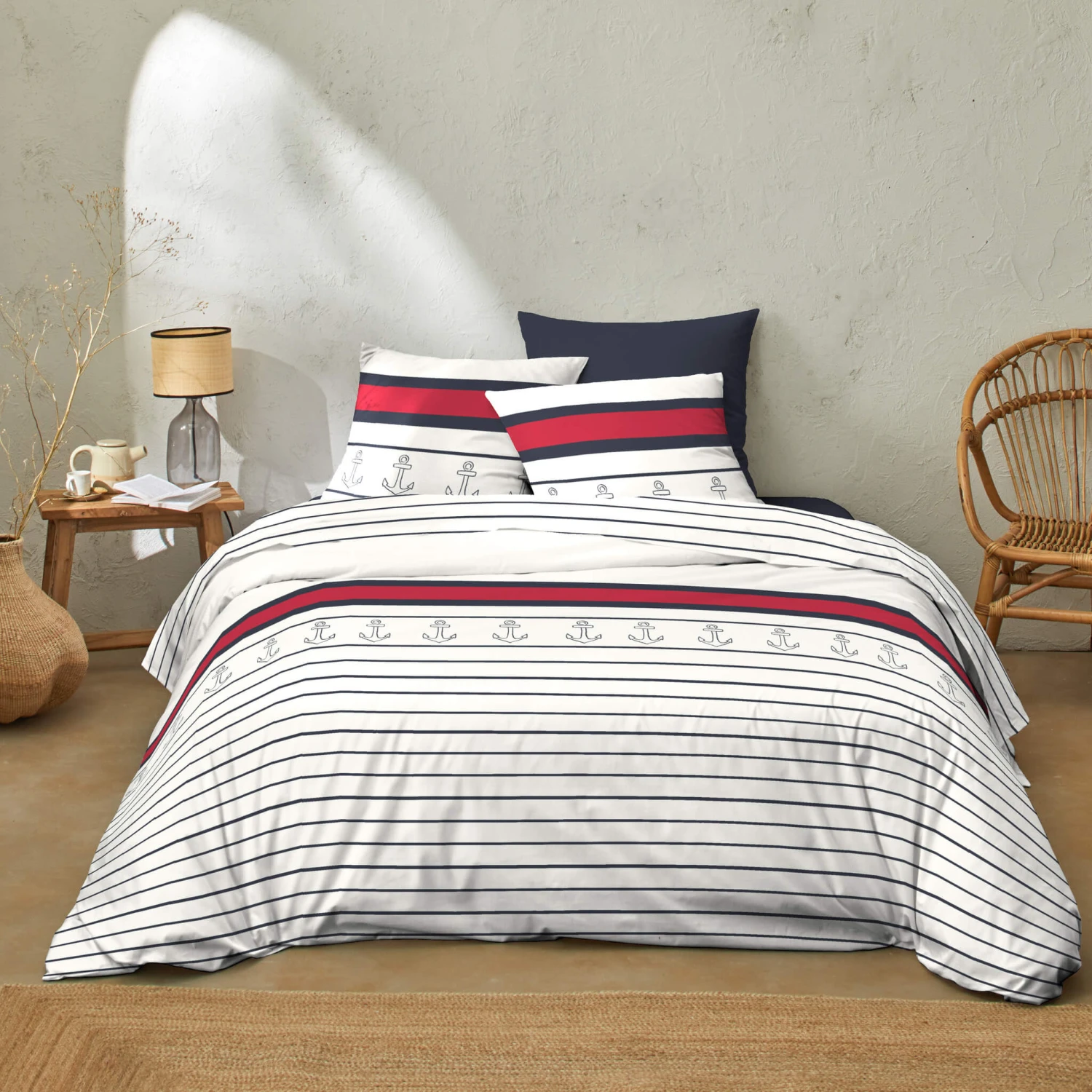 Optez pour la parure de lit Rade, de la marque Terre de Nuit. De simples liserés bleu marine sur un fond blanc pur permettent à cette parure de s’adapter à tous les univers de chambre. Pour parfaire le tout et donner une touche colorée à l’ensemble, vous retrouverez des motifs d’ancres ainsi qu’une bande rouge vif au centre de la housse de couette et des taies d’oreillers.